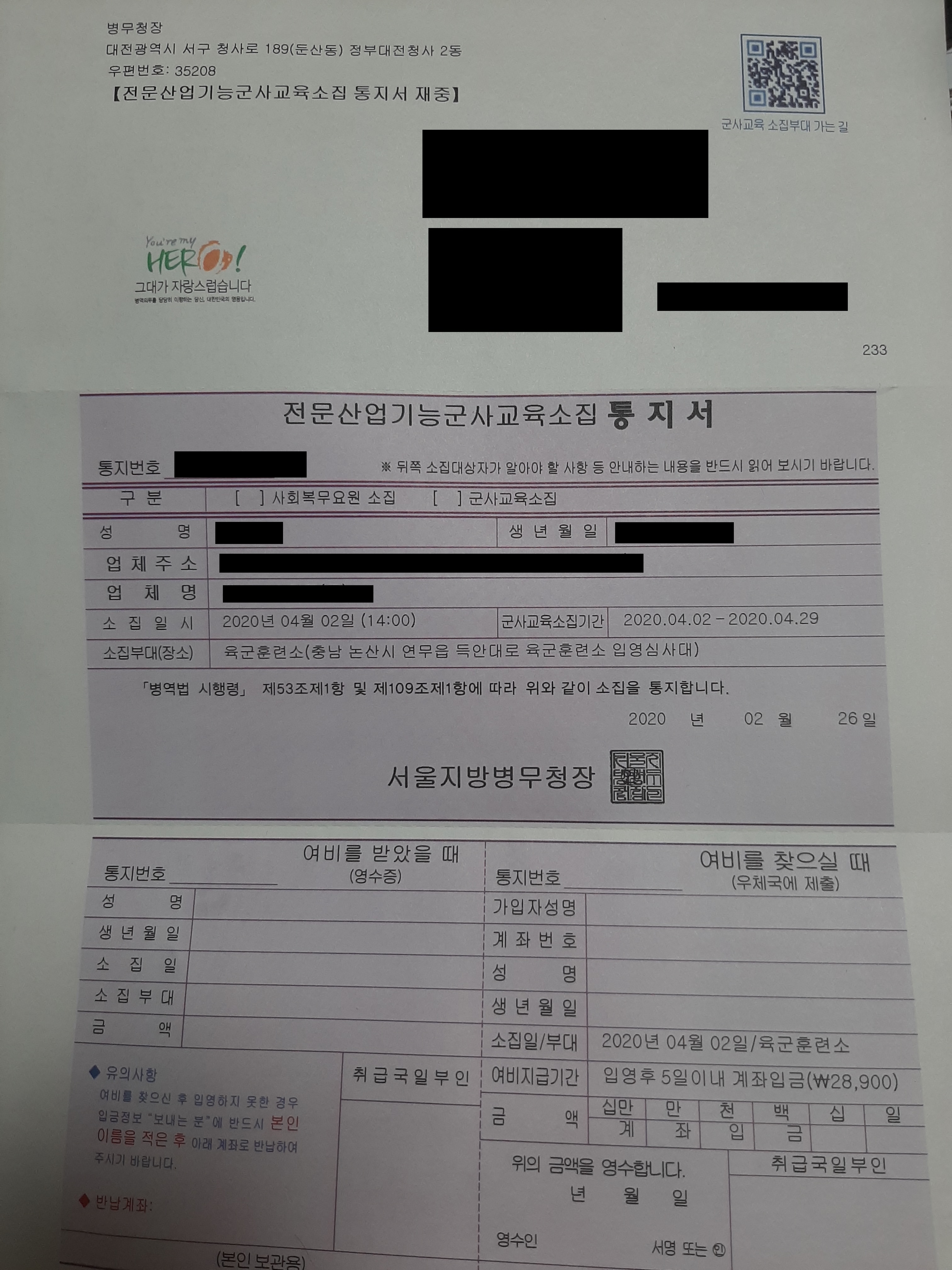 산업기능요원 군사교육 통지서 통지서를 딱 받았는데 딱히 실감이 나지 않습니다. 여비지급기간이 눈에 띄네요. 여비로 고속 버스를 타면 될 것 같습니다.