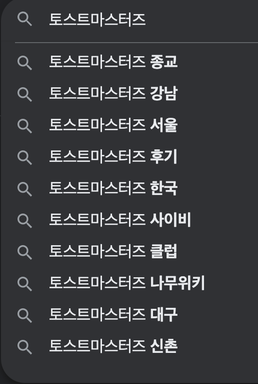제 컴에서만 그런지 모르겠는데 토스트마스터즈를 치면 첫번째가 "토스트마스터즈 종교" 예요. 다른 컴에서 어떻게 보이는지 너무 궁금하네요.